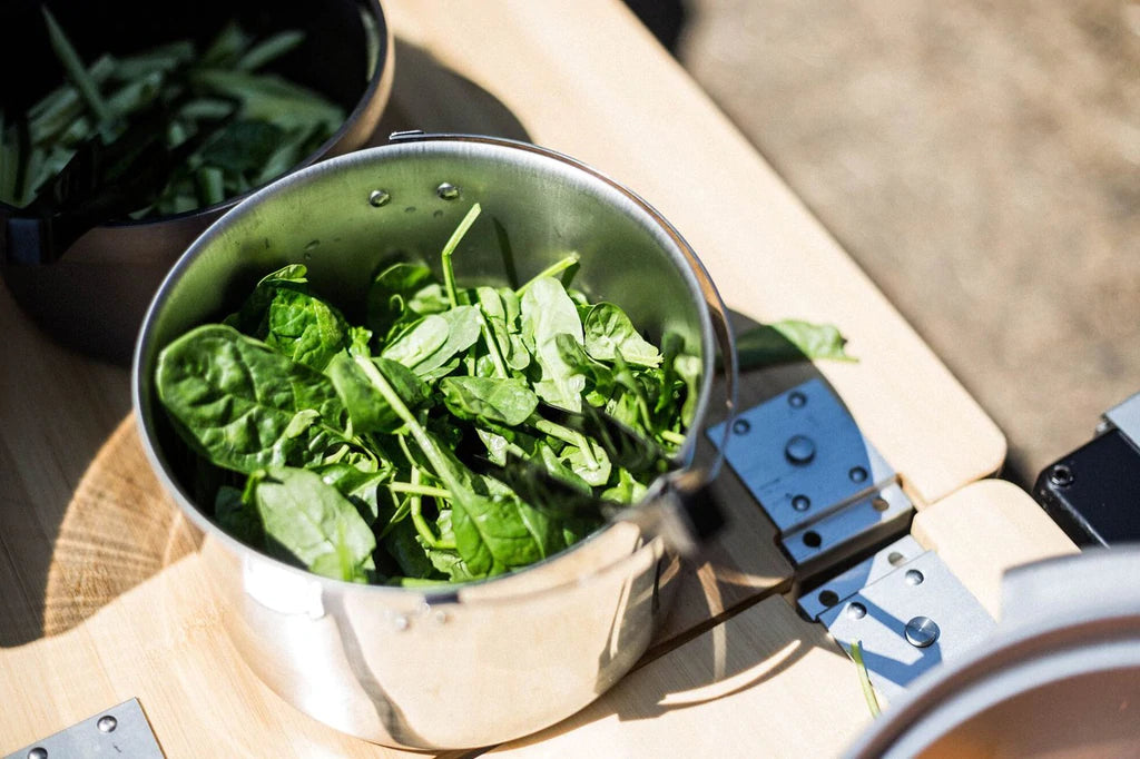 Designed in Japan, the Al Dente Set is made of polished stainless steel with wooden handles. Use the set on a stove or over a fire to cook for larger groups. The Al Dente Set includes two pots, two lids, and a mesh strainer.