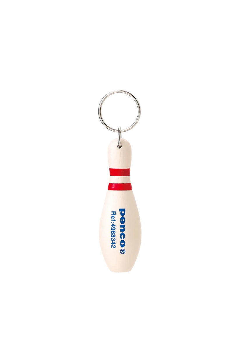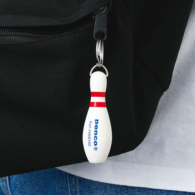 A ballpoint pen keychain in the shape of a miniature bowling pin by penco.
