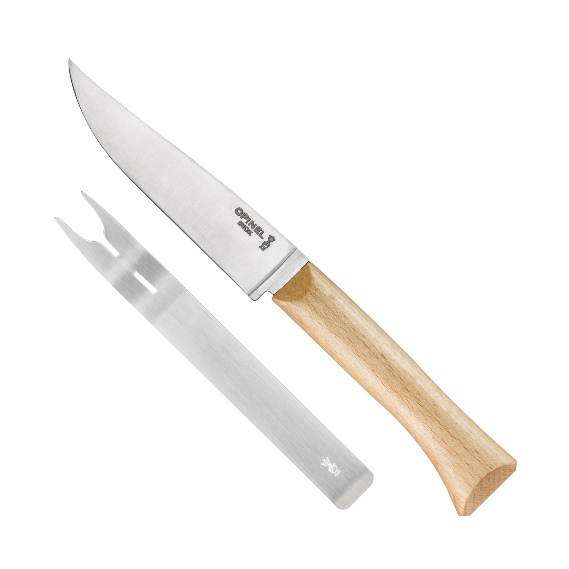 The knife features a beech wood handle, made from sustainably harvested wood grown in Europe. The stainless steel blade is durable, sharp, holds its edge, and is easy to maintain. The simple fork can be used while slicing or serving from the cheese platter, and also serves as a holder for the knife.