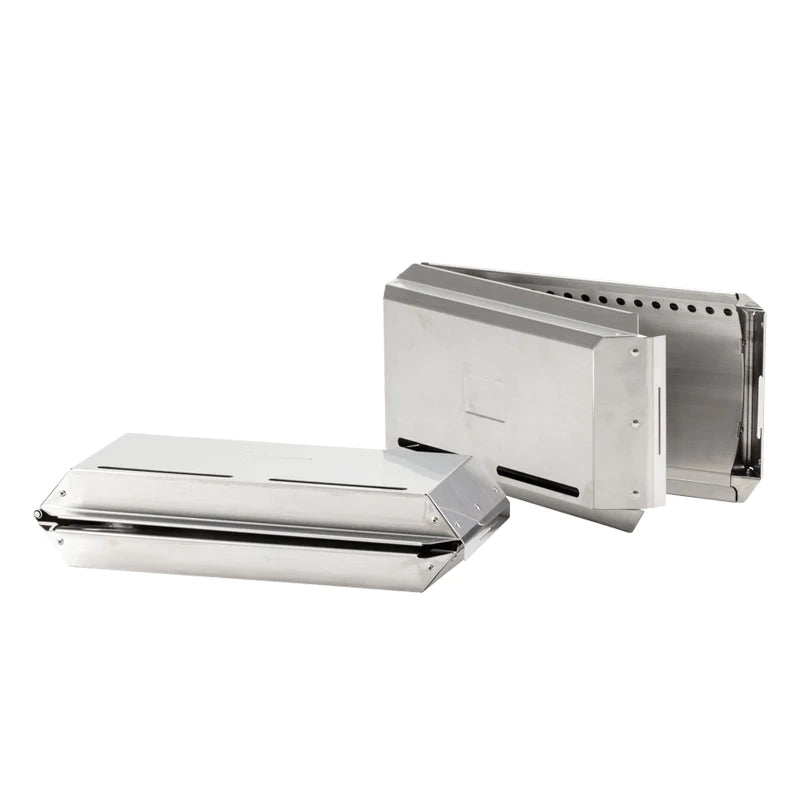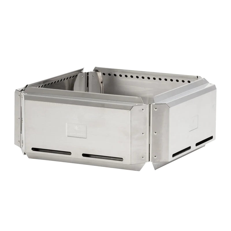 The Floga is a fireplace wall attachment that reduces smoke and campfire smells while generating secondary combustion by pre-heating and altering the airflow. Designed in Japan, the Floga is made of durable stainless steel and features a simple folding assembly. To use, gently place upon the Large Pack & Carry Fireplace when burning wood or coals to reduce the amount of smoke and smoke smells. After use, allow the unit to cool before hosing down, then let it air dry before placing it in its storage case.