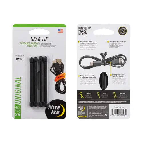 The patented Gear Tie is the most versatile way to wrap, hang, and organize nearly anything. Featuring a strong bendable wire interior that holds its shape and durable rubber exterior, Gear Ties can be twisted, tied, and reused over and over indoors and out.