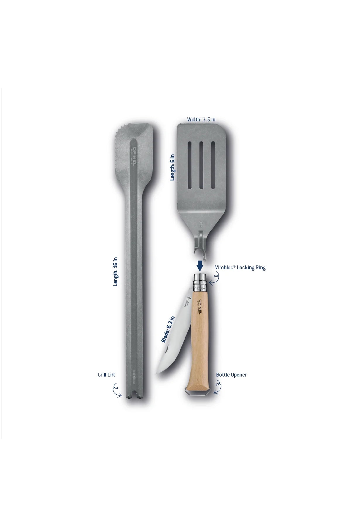 Made in France, the Opinel Grilling Set is ideal for outdoor grilling and over-the-fire cooking. This smart, robust, and efficient set features three premium utensils. The No.12B Stainless Steel Opinel folding knife is perfect for cutting meats, vegetables and fruits, and features a beech wood handle from sustainably managed French forests, equipped with a bottle opener at the end. The large Spatula+ is made of stainless steel and designed to insert into the knife handle and lock into place with the Virobloc locking ring. The stainless steel XL tongs feature a stonewashed finish and are long for convenient cooking over a grill, with notched tips and a grill lift built into the end of the handle.