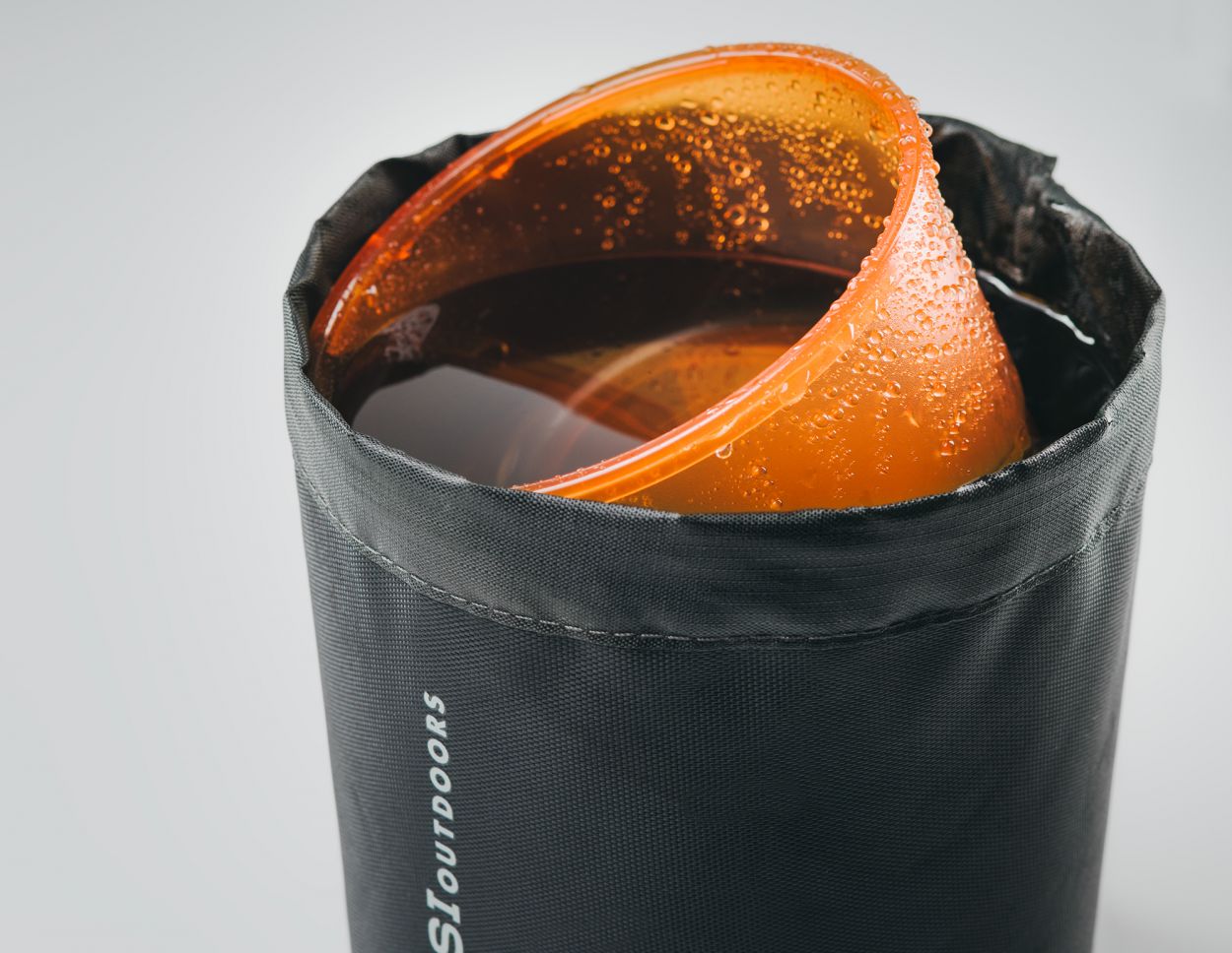 Welded stuff sack holds set while traveling and doubles as a sink or wash basin in camp