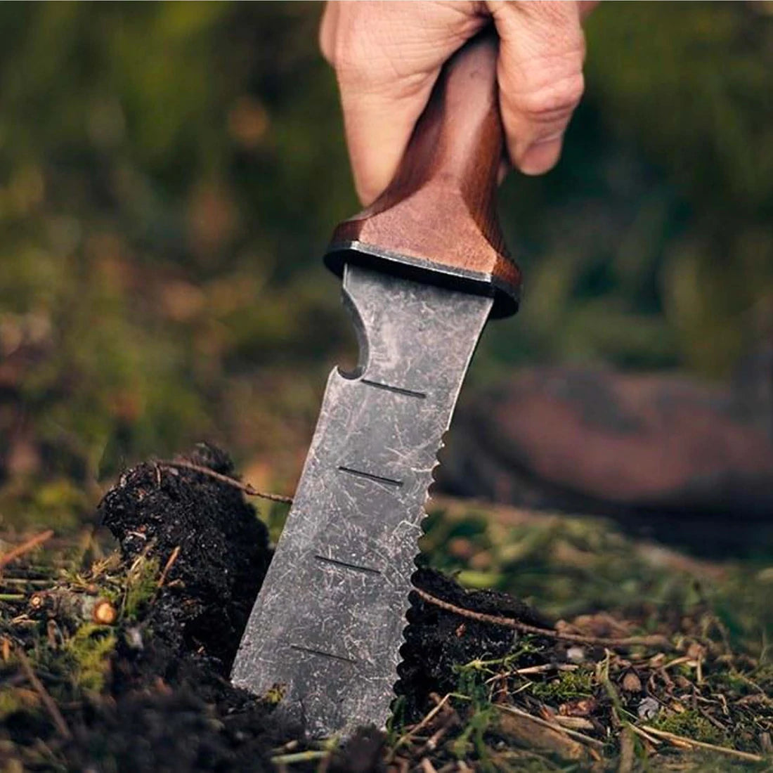 Originally designed to mimic the popular Japanese Garden Knife, hori hori roughly translates to “dig dig”. This hearty, multi-purpose tool is built for versatility. Pound in tent stakes with the flat pommel base. Measure planting depth with the handy inch marks. Saw a branch or whittle kindling with the rust-resistant doubled edge. Made for use in the backyard, camping, bush-crafting, or anywhere you need it.