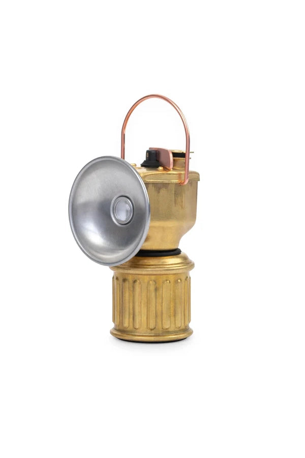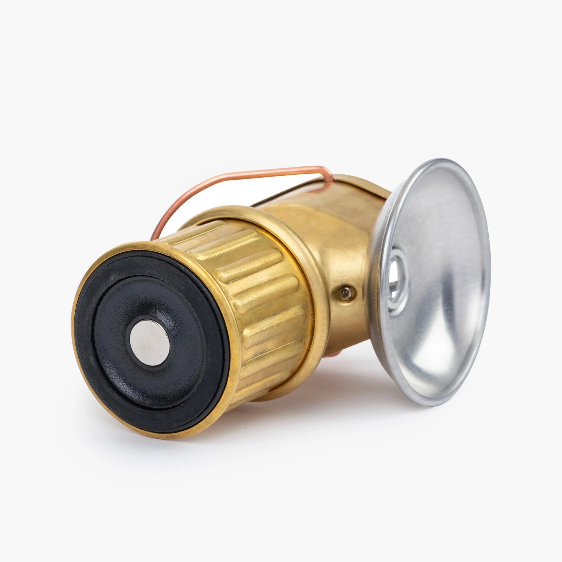 A completely unique collector's item. This vintage-inspired, single-direction lantern is modeled after an antique miner's lamp typically mounted on hard hats. Traditionally, this lamp was powered by gas and lit by a flame. Our updated version features a dimmable 2-watt LED light and a removable, rechargeable LI-ION battery. Included strong magnetic base features anti-slip materials: Place it on any metal surface. Pure, 100% matte brass feels heavy and comfortable in hand, while solid copper and polished aluminum accents add a premium, luxury quality. Beautiful and eye-catching, this lantern can be displayed indoors as a conversation piece and beautifully exist in any space.