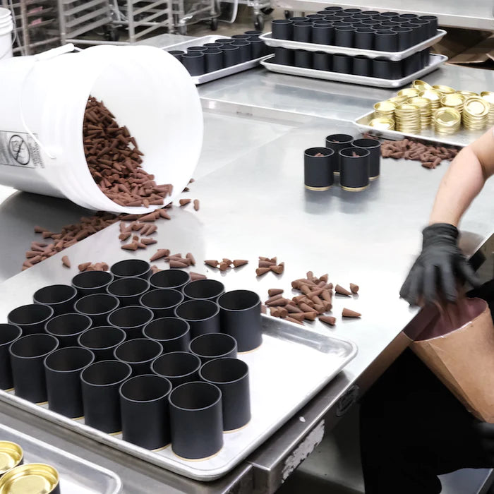 Alchemy Incense Cones are packaged in recyclable black paper tubes containing 30 cones, featuring gold metal lids that function as burners when inverted on a heat-resistant surface. Our wood-based incense cones are hand-dipped into fine fragrance oils at our Los Angeles factory.